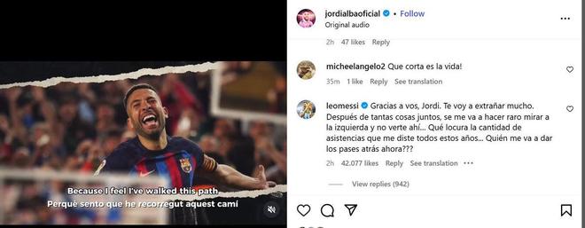 梅西在回应阿尔巴退役的Ins动态时写道:“谢谢你,阿尔巴。我会非常想念你。我们一起经历了这么多,当我再次看向左路却看不到你时,会感觉很别扭……这些年来你给我送了那么多助攻,真是太疯狂了……现在谁还会给我传身后球呢???”