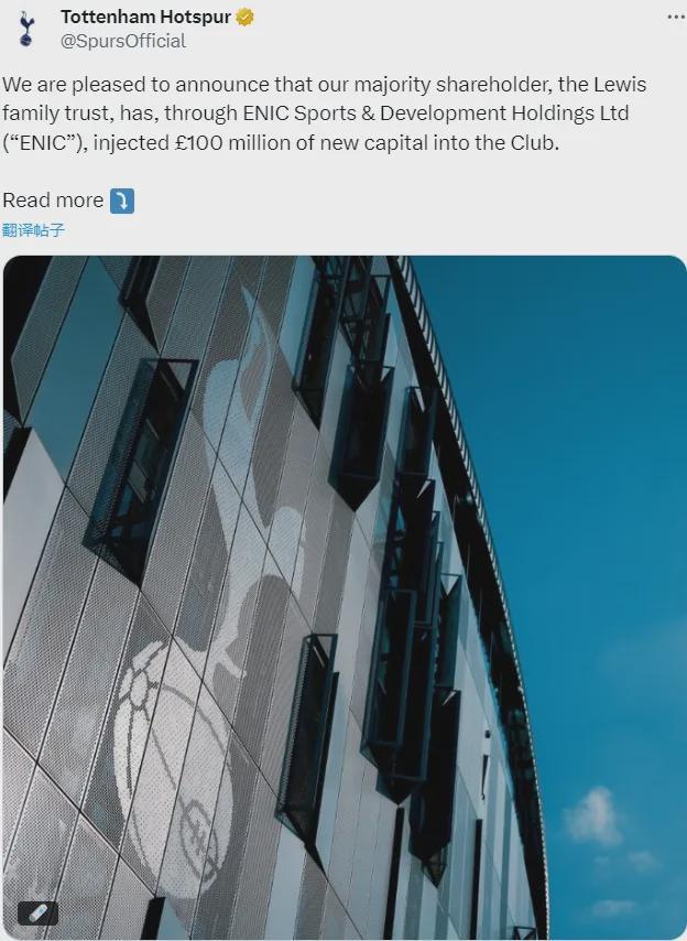 官方:热刺宣布俱乐部的大股东,刘易斯家族信托已经通过ENIC体育发展控股有限公司(ENIC)向俱乐部再次注资1亿英镑。